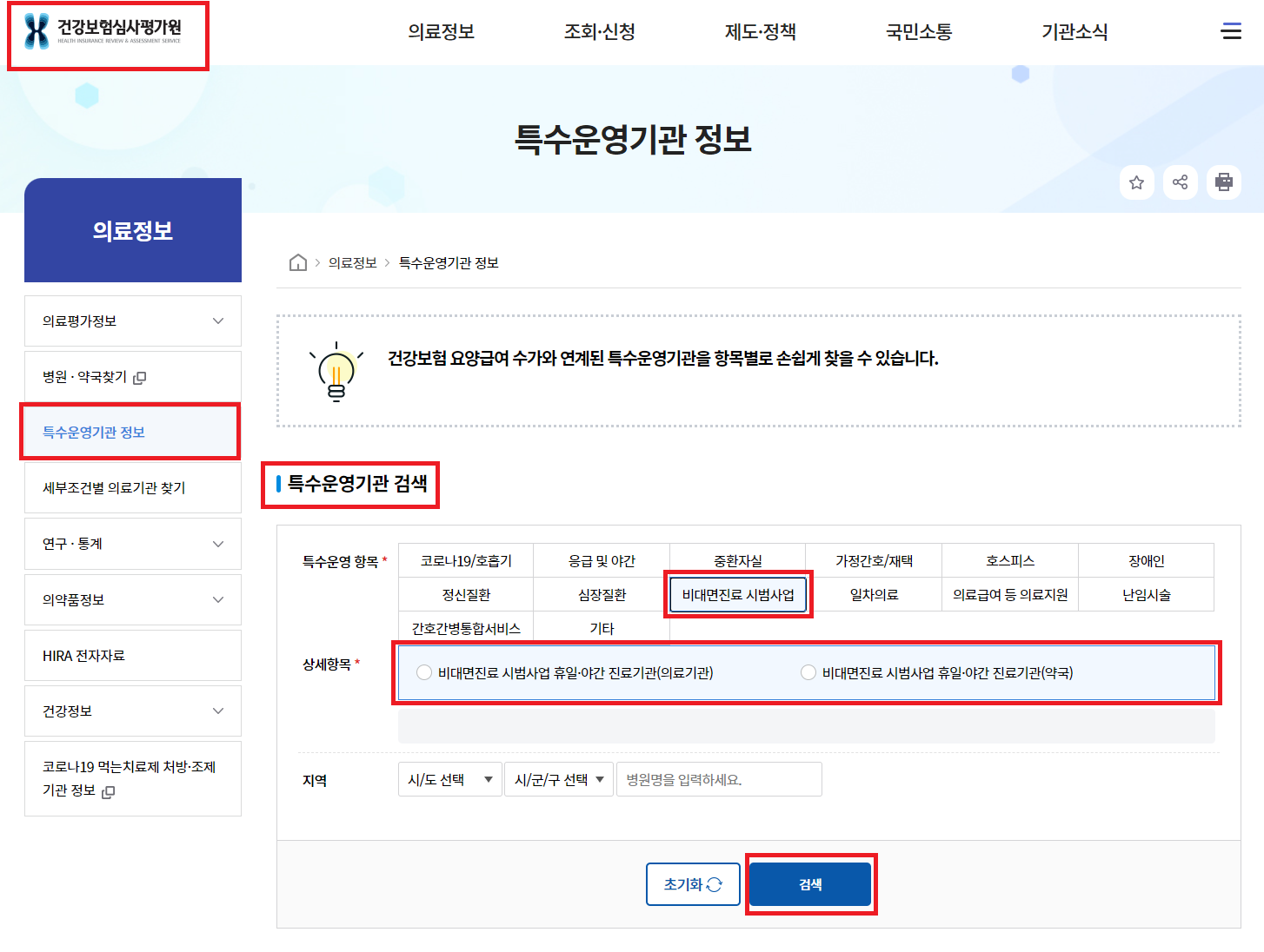 따라서 명절 연휴 기간에 갑자기 아프다면 건강보험심사평가원 홈페이지에서 '의료정보' 메뉴에 '특수운영기관 정보'에서 '비대면진료 시범사업'을 운영하는 의료기관과 약국을 찾을 수 있습니다.