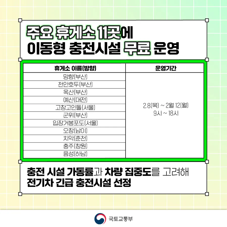 환경부에서는 전기차 운행 증가로 인해 충전에 불편함이 없도록 고속도로 휴게소 10곳에서 무료 이동 충전서비스를 제공하고 있습니다.