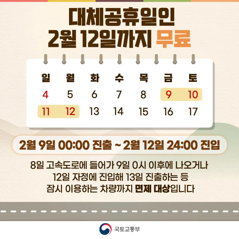 2/8 고속도로에 들어가 2/9 0시 이후에 나오거나, 2/12 자정에 진입하여 2/13 진출하는 등 잠시 이용하는 차량까지 면제 대상입니다.